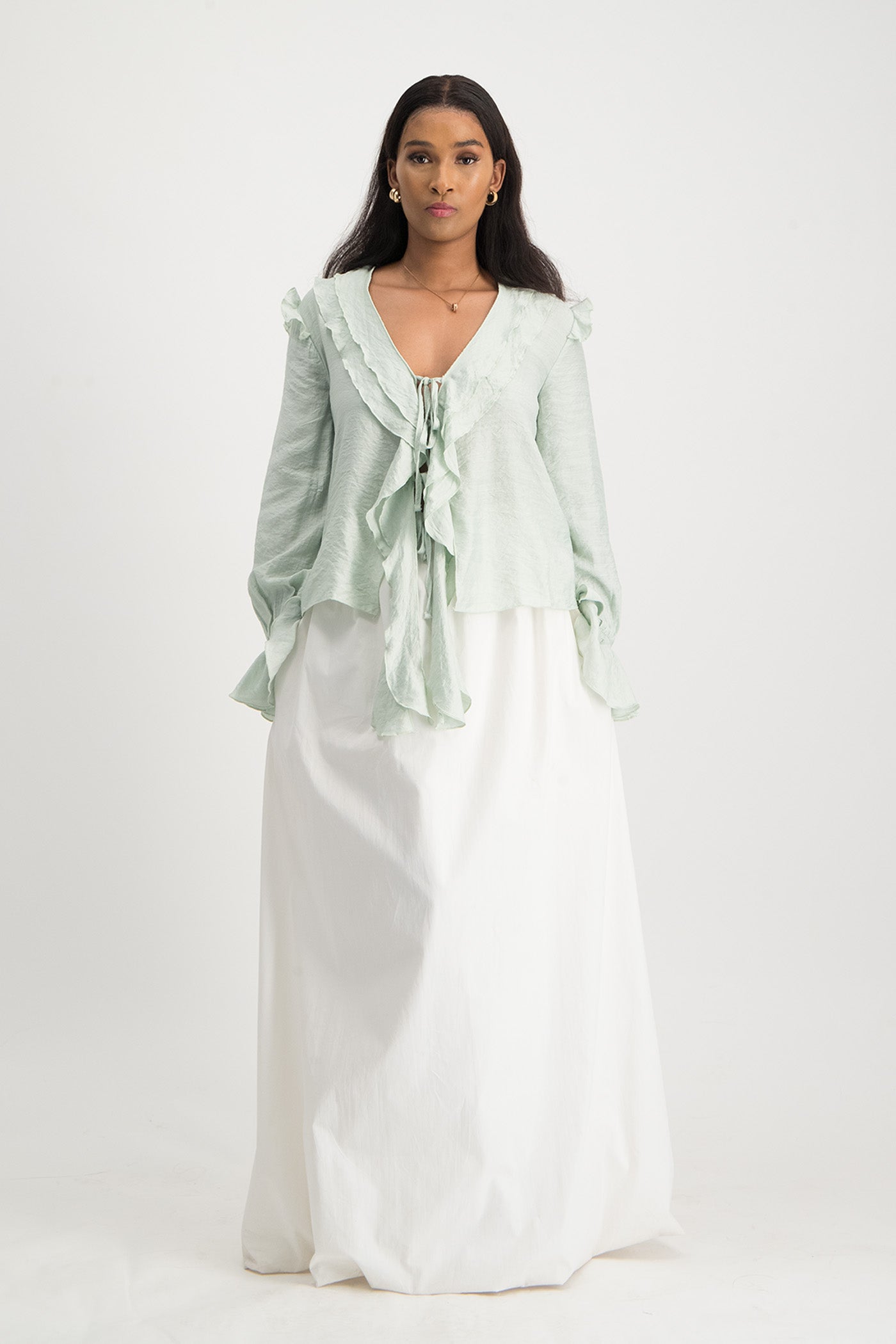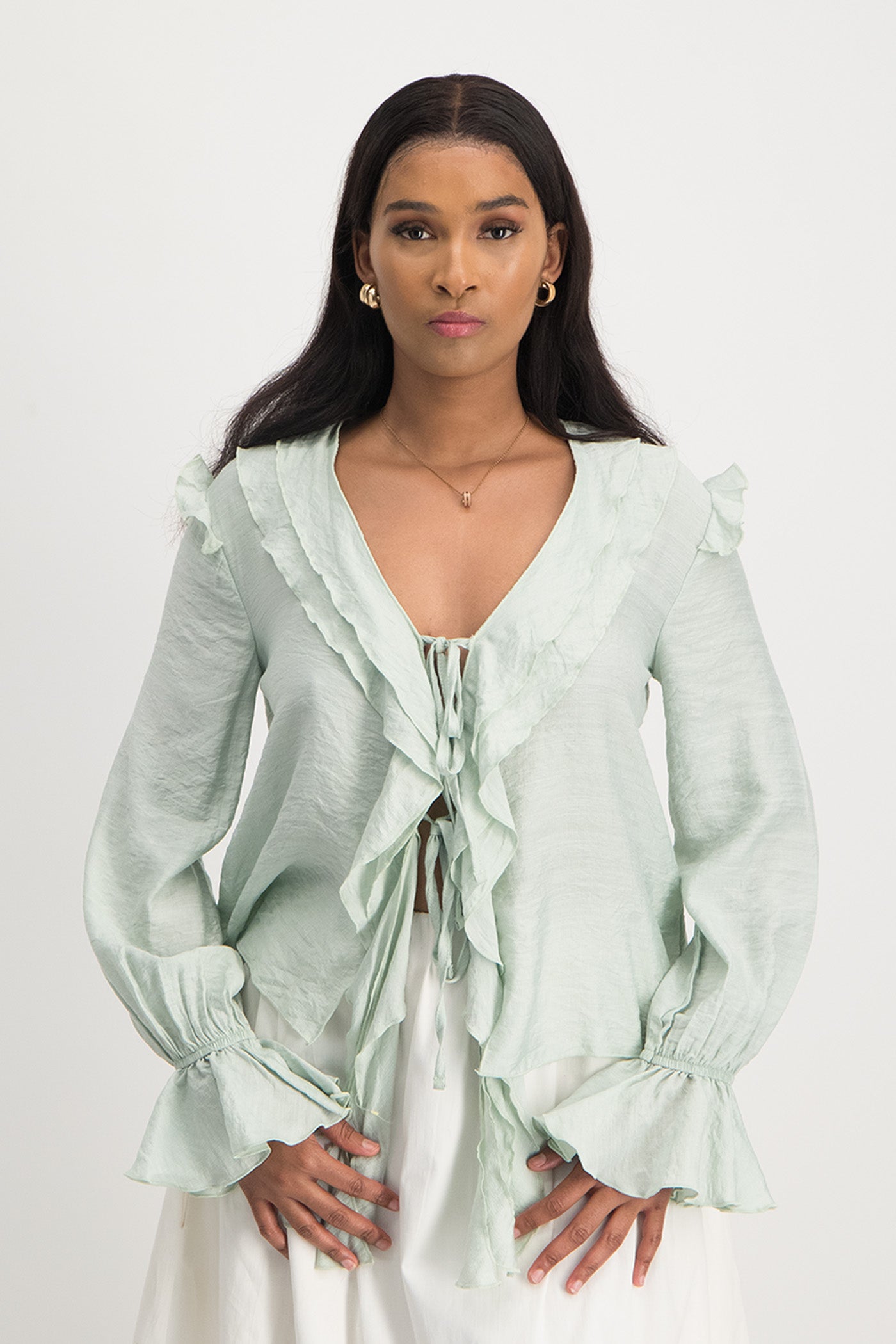 Spring/Summer isn’t complete without a touch of ruffles. Featuring a playful tie-front with ruffle accents and flared sleeves in vibrant seasonal hues, this versatile piece is a must-have for the season. Pair with your fave bottoms to finish off the look.